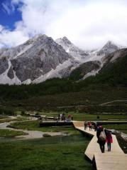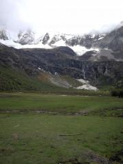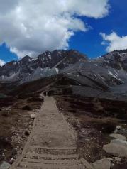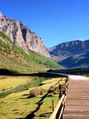 洛絨牛場群山環(huán)繞,風景優(yōu)美,猶如世外桃源一般,但這里海拔也不低,可能有4000米,不過到這里,可以乘坐游覽車,七公里的路程,坐游覽車需要20分鐘,十分節(jié)省體力,這樣為后來的大環(huán)線攀登可以節(jié)省體力,牛場旁有馬幫,可以騎馬去牛奶海