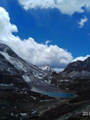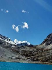 牛奶海實際就是一個名叫俄絨措的冰川湖,四周雪山環(huán)繞,湖水清瑩碧藍,白色的雪山環(huán)抱著蔚藍的湖水,這是牛奶海的來歷吧。我們一行騎馬的走路的中午登山回望俄絨措,收獲的不僅是美景,更是征服自然挑戰(zhàn)自我的喜悅。