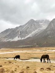個人認為長線的真正起點是洛絨牛場這里,可以選擇騎馬或徒步。就景色而言5月初還不是漂亮的時候,枯萎的草地還沒有復蘇,但又有別樣的美,同樣可以拍出大片的感覺。