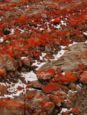 燕子溝顯得比較門清冷清,來這里的人本身就不多,選擇繞一大圈游覽的人就更少了?;蛘呶以搼c幸選擇了這樣一條人煙罕至的步道,正因為人少,步道上的積雪都不怎么融化,造就了一番別有情調(diào)的觀感,冰川河岸上的每一塊石頭都被披上了一件件紅色外衣,紅石在河流兩旁堆積,成群的紅石變成一種流動的紅色,與清洌的流水相伴順流而下,綿延數(shù)十公里,如此規(guī)模極其壯觀。
