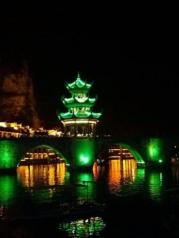 祝圣橋上的燈光在不停地變換著顏色,一會(huì)藍(lán)一會(huì)綠,接著又紫了……河面上,幾艘小游船靜靜地飄浮在水面,四周靜悄悄的。