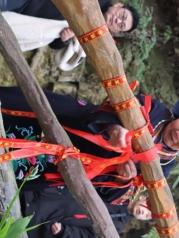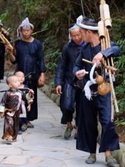 在岜沙苗寨,每出生一個(gè)孩子,其父母就會(huì)種下一棵樹,作為孩子的“生命樹”,陪伴孩子成長(zhǎng);逢年過(guò)節(jié)或是孩子身體不適,其父便把孩子帶到荷樹旁進(jìn)行祭拜,或是“喊魂”“撿魂”,祈求樹神保佑健康;一直到舉行完成人禮后結(jié)束。如果孩子過(guò)世了,家人就砍掉那棵樹,用于埋葬逝者,再在墳頭種上一棵新的樹苗,表示生命以另一種形式延續(xù),稱為樹葬。在他們的觀念中,一切來(lái)自自然,一切回歸自然!全寨沒(méi)有一個(gè)理發(fā)店,田間地頭老少爺們相互用鐮刀給對(duì)方剃頭,至今仍保留這一習(xí)俗。