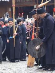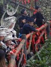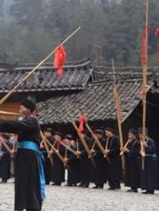 對(duì)于來(lái)之前從攻略上看到的進(jìn)門前的攔門酒,當(dāng)時(shí)還腦補(bǔ)著岜沙苗寨的寨民都有槍,如果不喝酒,惹惱了拿小槍槍突突你胸胸。這次正好趕上了下午4點(diǎn)的演出,表演的演員是苗寨里的村民原生態(tài)奉獻(xiàn),幾乎男女老少齊上陣,展現(xiàn)岜沙人的生活風(fēng)俗,原汁原味。景區(qū)一天應(yīng)該有多場(chǎng)演出,4點(diǎn)這場(chǎng)是當(dāng)天最后一場(chǎng),之前沒(méi)查攻略,比較幸運(yùn)碰上了。集體蘆笙舞表演完,就是一個(gè)苗族婚禮節(jié)目,主持人讓扮演新娘的人從觀眾里挑了一位帥哥來(lái)扮演新郎,進(jìn)行互動(dòng)。苗族婚禮是有巫師進(jìn)行儀式祝福的,新郎和新娘需要向巫師敬酒。然后是新郎和新娘給大家發(fā)“祝福果”???具體忘記叫啥了,當(dāng)然我們也是要向新人送上祝福啦。哦,對(duì)了,新郎三年后回來(lái),還得記得這位“娘子