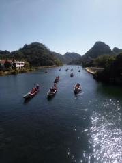 壩美村,這是本次行程我最喜歡的一個(gè)地方。一個(gè)很小的壯族村寨,它的驚奇之處是,在飛機(jī)高鐵高速發(fā)達(dá)的現(xiàn)代社會(huì),壩美村至今未通公路!進(jìn)入村子必須要先坐一段馬車(chē)抵達(dá)溶洞口,然后坐船經(jīng)過(guò)一公里長(zhǎng)的溶洞才能進(jìn)出村子。 坐船進(jìn)巖洞里一片漆黑,偶爾有山縫中撒下的微光,有點(diǎn)恐怖,我想起盜墓筆記里那個(gè)溶洞,太像了!下了船走出洞口那一刻,豁然開(kāi)朗,村子只有百十戶(hù)人家,民風(fēng)純樸,風(fēng)景優(yōu)美,四周群山環(huán)繞,還真是找到世外桃源的感覺(jué)了!