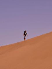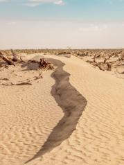 有些人認(rèn)為穿越沙漠意味著征服,而我覺得穿越沙漠只是為了親近沙漠。進(jìn)入塔克拉瑪干,我們的視覺、呼吸、聽覺、甚至我們的味覺都是塔克拉瑪干的,當(dāng)身處沙漠腹地,當(dāng)你全身的感官都與沙漠融為一體時,你會幻想從空中看到自己,你就是沙漠里的一粒沙,一花一世界,一沙一浮生,睜開眼,你看見沙漠,閉眼上,你聽見大海。