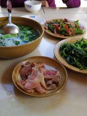 諾鄧村離諾鄧鎮(zhèn)很近。平日里去的,人也很多。村邊有一口鹽井,據(jù)說兩千多年了,是茶馬古道的起點。山上的村民中,家家懸掛著整火腿,蔚為壯觀。還有賣小坨鹽的,超可愛。山腳下有一家農(nóng)家樂,桌子板凳是用大石板,大木頭做的。炒了一盤火腿青菜,要了一盆西紅柿雞蛋湯,艾瑪,忒好吃了。